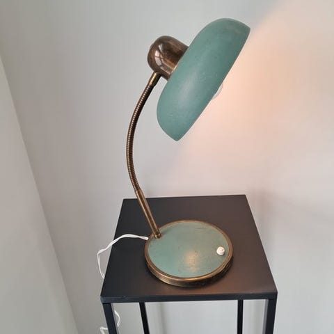Kobber- og messingmini ræve skrivebordslampe i god stand med små aldersspor, fra 1970–1980, fremstillet i Japan, stil midcentury modern, ledningsført og testet til E27 pære (pære ikke inkluderet), højder 32 cm, bredde 31 cm, dybde 27 cm, vægt 6 kg, materialer kobber, messing, stål og glas. Klik på den blå "gå til varen" knap, for at købe eller byde på denne vare. Den samlede pris vil blive vist inden du afgiver dit bud.
