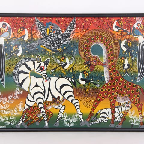 George Lilanga (1934–2005), Ebu Niachie Nikuu Wangu, 1999, oliemaleri, 61 × 61 cm, stilleben, original udgave, signeret, i god stand, Tanzania. Klik på den blå "gå til varen" knap, for at købe eller byde på denne vare. Den samlede pris vil blive vist inden du afgiver dit bud.