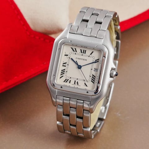 Cartier Panthère 1320, dameur quartz-armbandsur fra 1990’erne til 1999’erne, 22 mm stålkasse og stålrem, hvid skive med let patina, glas i god stand, samlet remlængde 16 cm, vandtæthed 30 m ikke garanteret, original æske inkluderet, papirer og garanti ikke inkluderet. Klik på den blå "gå til varen" knap, for at købe eller byde på denne vare. Den samlede pris vil blive vist inden du afgiver dit bud.