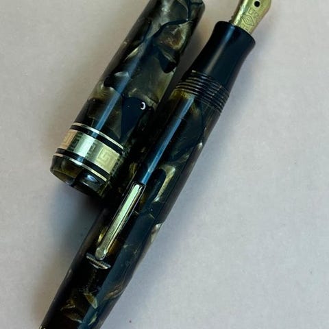 Optima Mare kuglepen med blå marmoreret celluloid krop og guldfinish, fremstillet i Italien mellem 2000 og 2010, 130 mm lang og 13 mm i diameter, serienummer 1975, ubrugt og i funktion, begrænset udgave. Klik på den blå "gå til varen" knap, for at købe eller byde på denne vare. Den samlede pris vil blive vist inden du afgiver dit bud.