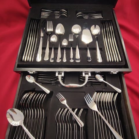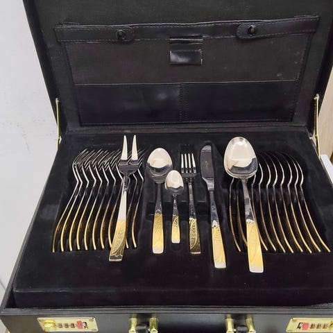 Rart og fascinerende bestiksæt fra Pinti Inox, komplet til 6 personer, opbevaret i sin originale antikke emballage, et element, der i dag er stadig sværere at finde, og som har stor samlermæssig interesse.