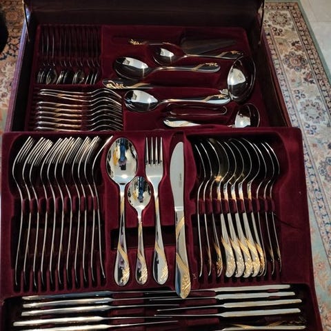 Krupp Berndorf DA Dolce - 55 dele bestikservice - forkromet. Dolce-service med nogle serveringsbestik som beskrivelse. 12 dessertknive med længde 21 cm, 11 dessertgafler på 19 cm, 10 dessertskeder på 19 cm, 8 serveringsskeder på 21,5 cm, 2 serveringsgafler på 21,5 cm, 9 is skeer på 14 cm, 1 suppeske, 1 stor ske, 1 stor gaffel.