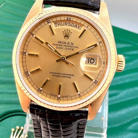 Rolex Day-Date 36, reference 18038, cirka 1985, automatisk bevægelse Cal. 3055, guldfarvet kasse og bezel, champagne dial, sort læderrem, kassens diameter 36 mm, remlængde lang (>200 mm), safirglas, originale papirer inkluderet, original garanti inkluderet, ingen original æske, særdeles god stand med beskedne slidmærker. Klik på den blå "gå til varen" knap, for at købe eller byde på denne vare. Den samlede pris vil blive vist inden du afgiver dit bud.