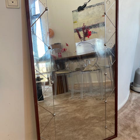 Vægspejl i træramme 63x102 cm.,d.17cm., med en hylde og 2 skuffer, special lavet af møbelsnedker i meget god stand.