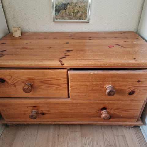 Og tilhørende kommode med mørke blå fliser dekorative felter på de 2 skuffer