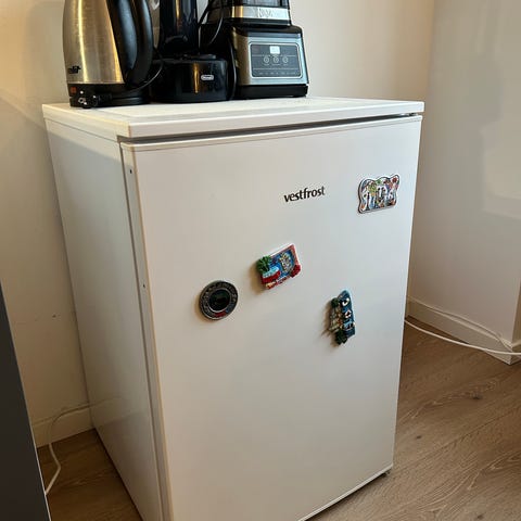 Lille køleskab (mrk Vestfrost) med frost til isterninger. BxHxD 55x85x55. Til kollegieværelse eller som køleskab i bar.