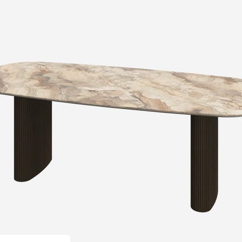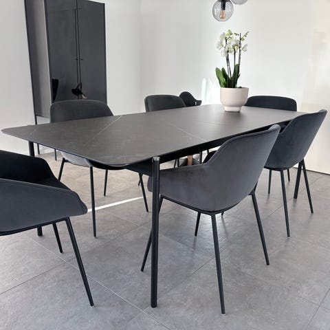 Askegrå slidstærk keramik spisebord med ilægsplade i keramik . Sort moderne metalstel. Måler: H: 74 B: 99 L: 183 udvidet længde 263 cm