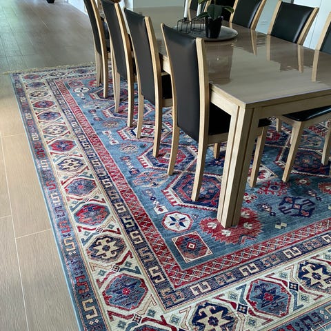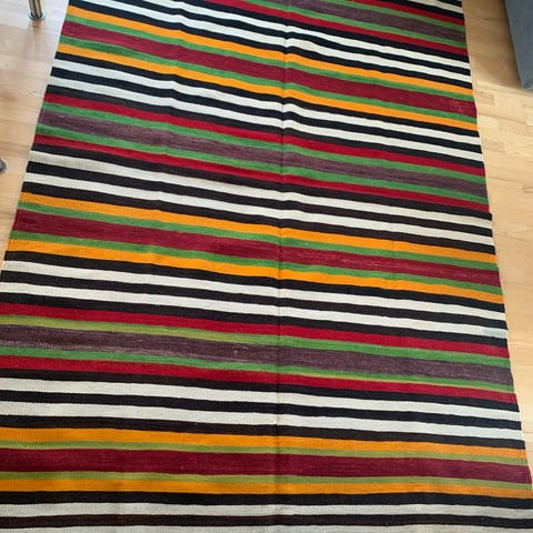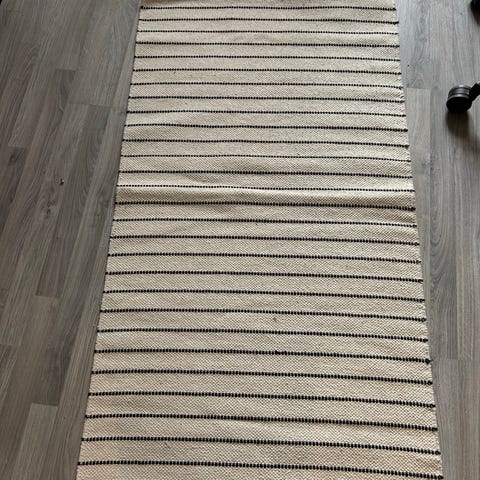 Marimekko tæppe i lys farve. Tæppet har et langluvet, blødt udtryk med et enkelt, grafisk mønster. Egnet til brug i stue, soveværelse eller andre opholdsrum, hvor der ønskes et tekstilt gulvunderlag med dæmpet, nordisk stil.