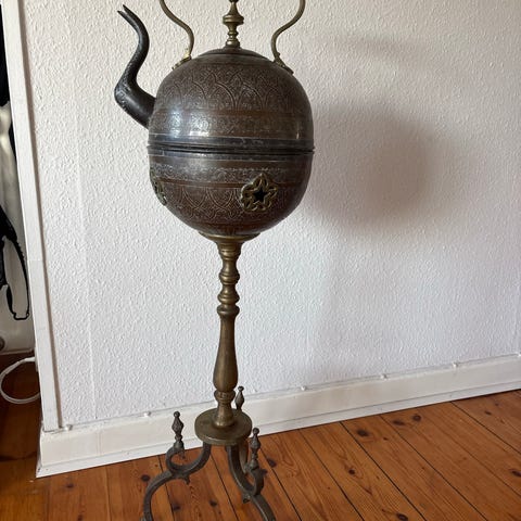 Dekorativ ældre kaffekande med flotte blomsterornamenter og låg. Fremstår i forsølvet metal eller messing med patina, som giver et autentisk vintage-udtryk. Velegnet som pynt, rekvisit eller til samling.