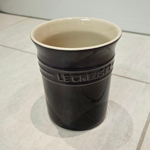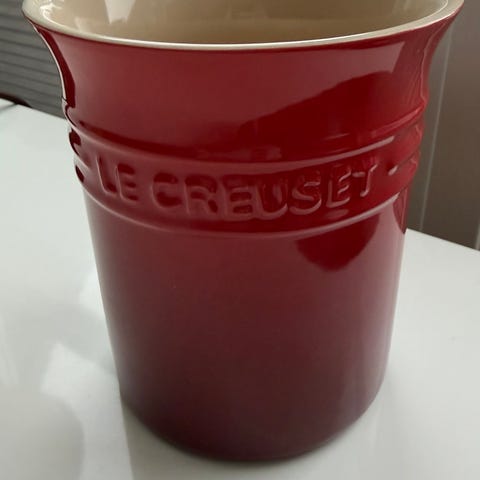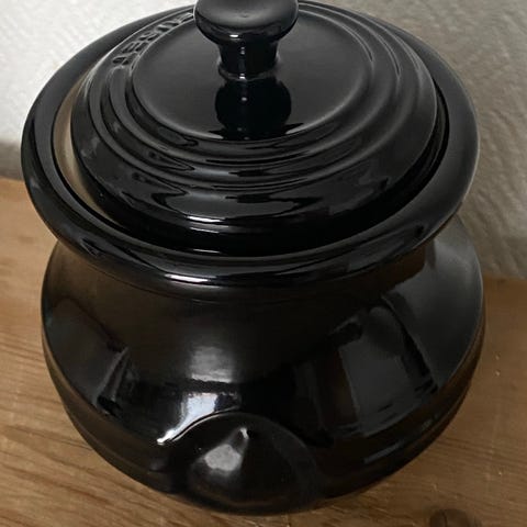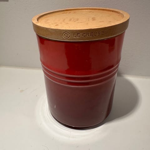 Le Creuset krukke i rød stentøj. Firkantet beholder med låg og åbning i låget til ske eller redskab. Velegnet til opbevaring i køkkenet, f.eks. til salt, sukker eller andre tørvarer. Klassisk Le Creuset design med logo på forsiden.eller syltetøj