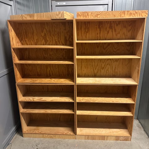 Så er det mulighed for den helt store AT BO bogreol. 6 hele reoler og 6 halve + sokler. Træsort birkekrydsfiner, men jeg er ikke 100% sikker. Reolerne kan flyttes. Reolerne er i rigtig god stand, med enkelte brugsmærker, primært mærker fra at de har været skruet sammen.