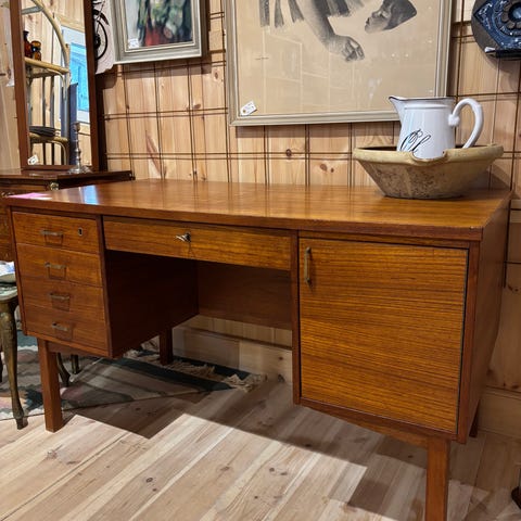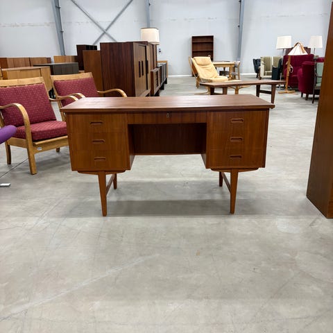 et fin skrivebord i teaktræ med 7 skuffer