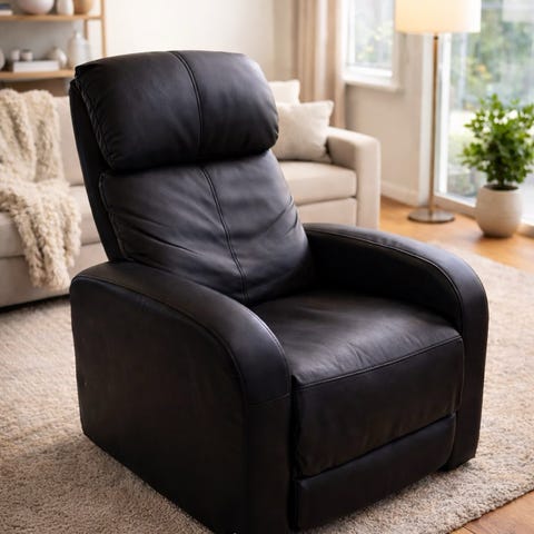 IKEA lænestol med sort læderbetræk og armlæn i lyst træ. Stolen har høj ryg og polstret sæde, der giver støtte til ryg og siddekomfort. Velegnet som læse- eller hvilestol i stue, kontor eller soveværelse. Neutral stil, der passer ind i mange typer indretning.