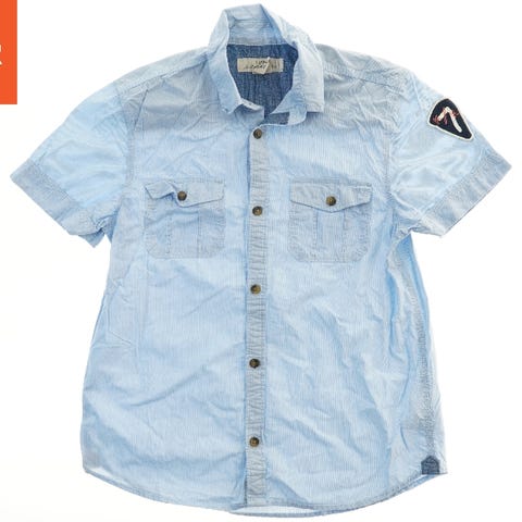En lys blå skjorte med små mørke mønstre. Skjorten har lange ærmer og en knaplukning foran. Den er lavet af let stof og har en klassisk krave.