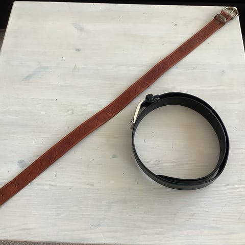 Ukendt mærke bælte i brun læder til unisex. Bæltet har rund metalspænde og flere huller til justering af længde. Velegnet til brug i bukser eller som taljebælte afhængigt af størrelse. Materialet fremstår som kraftigt læder med synlige brugsspor. Mål kan aflæses cirka ud fra tommestokken på billederne. Retro