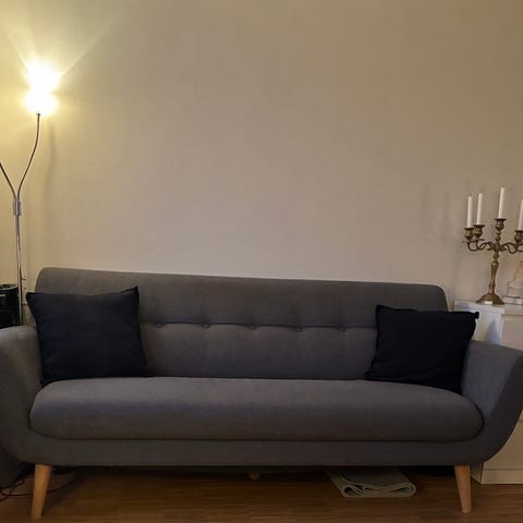 Sæt bestående af sofa og lænestol i stof. Sofaen er i gråt betræk med to sædehynder og to ryghynder. Lænestolen er i lyst stof med brede armlæn og sorte ben. Begge møbler har et enkelt, moderne udtryk og er velegnede til stueindretning.
