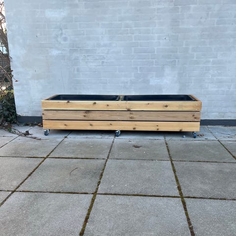 Plantekassen måler 65cm x 65cm og er 60cm høj. Selve kassen er ca. 25cm dyb.