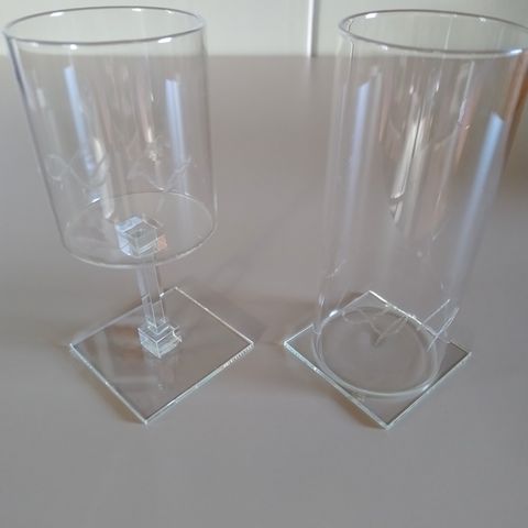 Glassene har forskellige former og højder, herunder både lave og høje modeller med rundet og let buet form.