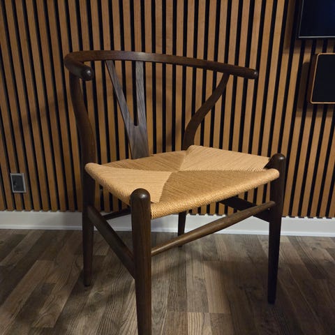 Hans J. Wegner CH24 stol birthday edition. Spisestol med klassisk Y-stolsdesign, udført i valnød med formspændt ryglæn og karakteristisk Y-formet rygstøtte. Sædet er betrukket med rødt læder. På undersiden sidder en messingplade med indgravering, der angiver 2019 limited edition og designerens navn. Velegnet som spisebordsstol eller som enkeltstående stol i stue, kontor eller entré.