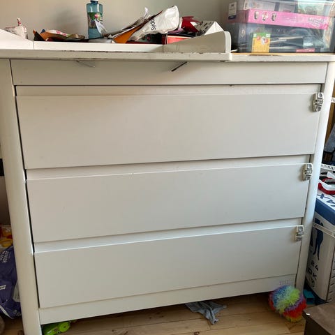 Den fineste vintagekommode i massivt træ, som vi har brugt som puslebord. Malingen er, som det ses på fotos, skallet af hist og her, men selve kommoden fungerer som den skal, og skabsdørene og skuffen kan åbne og lukke fint.
