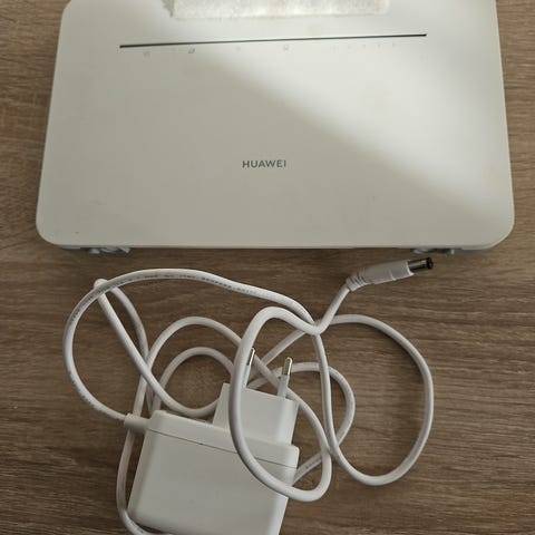 Huawei B315s-22 router i hvid. Enheden har flere LAN-porte på bagsiden til tilslutning af kablede enheder samt strømtilslutning. Routeren understøtter trådløst netværk (Wi-Fi) og er egnet til brug som central enhed til internetforbindelse i hjem eller mindre kontor. Leveres med strømforsyning som vist på billederne.