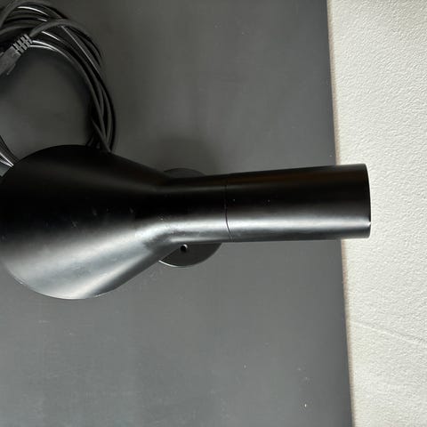 Louis Poulsen AJ væglampe i sort, designet af Arne Jacobsen. Lampen er en vægmonteret model med justerbart lampehoved, der gør det muligt at rette lyset efter behov. Overfladen fremstår i en ensartet, mat sort farve. Egnet som læselampe ved seng eller sofa samt som retningsbestemt belysning på væg.