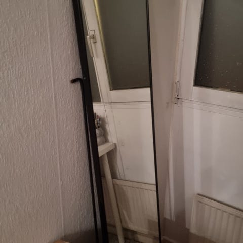 IKEA spejl med stativ i sort metal. Fritstående spejl med rektangulær form og dekorativ metalbue øverst. Spejlet er egnet til brug i soveværelse, entré eller garderobe, hvor der er behov for et helkropsspejl, der kan stå på gulvet ved hjælp af det integrerede stativ.