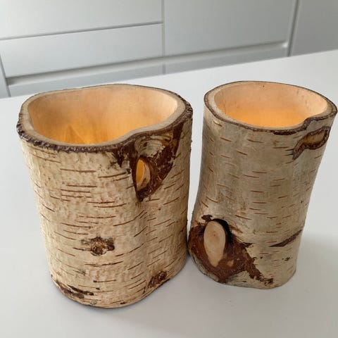 De lyse stager er 12 og 9 cm høje, ubehandlet birk.