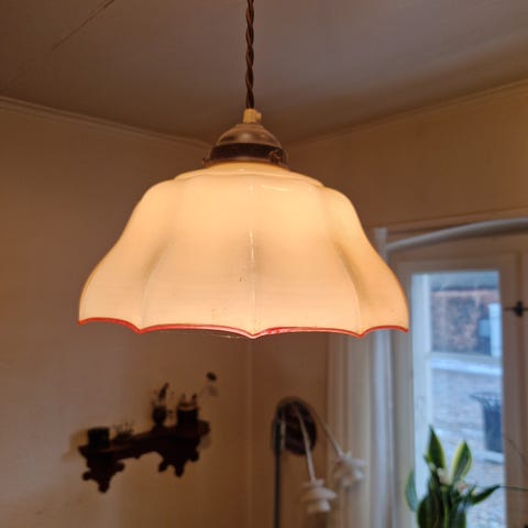 Dette er en vintage loftslampe fra 1900-tallet, fremstillet af glas, metal og porcelæn.