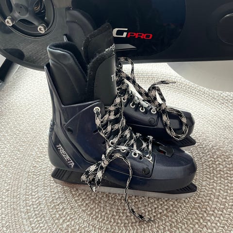 Graf ishockeyskøjter i børnestørrelse 30. Klassiske sorte skøjter med snørelukning og polstret pløs for komfort. Fast hælkappe og stabil ankelstøtte, egnet til ishockey og generel skøjteløb på is. Understel med faste skøjteklinger beregnet til brug på isbaner.