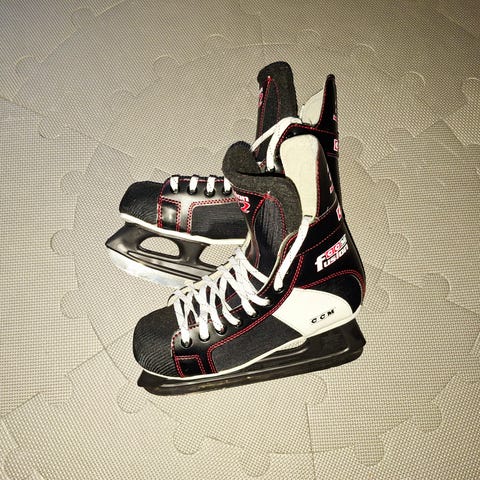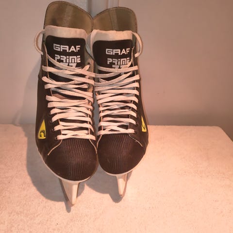 Graf Sueper 101 ishockeyskøjter i sort. Klassiske ishockeyskøjter med snørelukning og polstret pløs for støtte omkring anklen. Skøjterne har hvide stålsko og grafiske detaljer i hvid og gul på siden. Velegnet til ishockey og generel skøjteløb på isbaner.