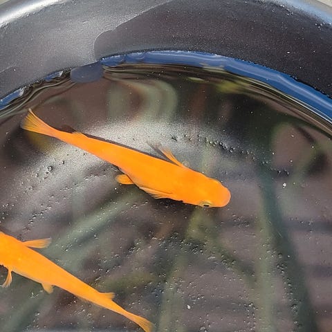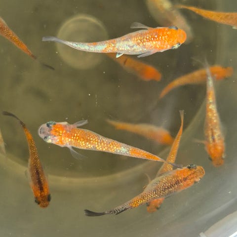 Friske og sunde ungfisk af arten Risfisk / Medaka / Oryzias latipes af typen “Platinum” sælges.