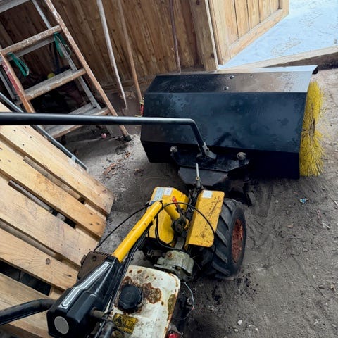 Kawasaki FA210 fejemaskine med frontmonteret kost. Maskinen er benzindrevet og udstyret med Kawasaki FA210 motor som kører perfekt., som fremgår af mærkaten på motorhuset. Fejemaskinen har håndtag med betjeningsgreb til frem og tilbage og hjultræk, hvilket gør den egnet til rydning af sne, grus og snavs på gårdspladser, indkørsler og andre udendørs arealer. Konstruktionen er primært i metal .