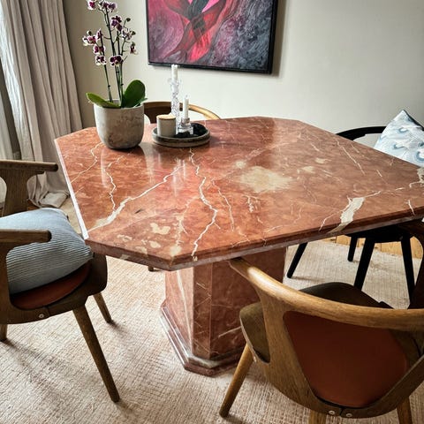 Unikt og specialfremstillet spisebord med marmor bordplade Ø130 og messingbelagt søjle.