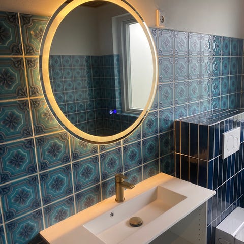 Insalco LED badeværelsesspejl med integreret LED-belysning. Spejlet har en organisk, afrundet rektangulær form og måler ca. 99 x 67,5 cm ifølge emballagen. Bagsiden er udstyret med el-komponenter og tilslutningskabel til strøm. Velegnet til montering på badeværelse eller andre rum, hvor der ønskes spejl med indbygget lys.