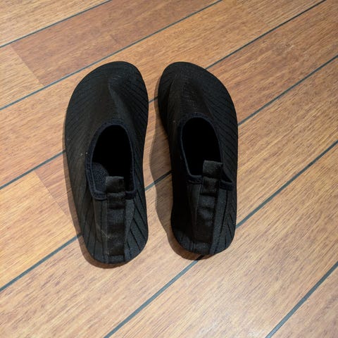 Disse sko er en lyslilla badesko. De har en komfortabel, let og elastisk materiale. Sålen er designet med skridsikre mønstre for at forhindre glidning. Skoene har en velcro lukning, som gør dem nemme at tage af og på, samt en solid hælstrop for ekstra støtte. Størrelsen er 39.