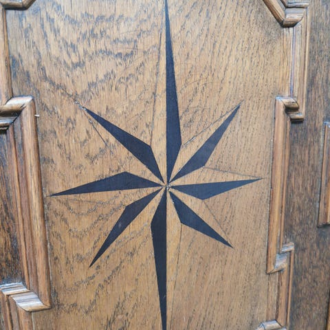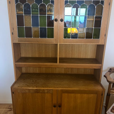 2 stk. skabe (vitrine, chatol) i massiv egetræ og lille sidebord / sofabord i massiv egetræ med håndmalede hollandske fliser i fajance (dansk kunstner).