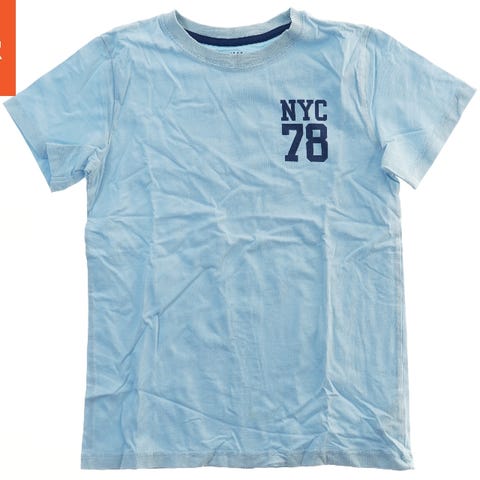 En kortærmet lyseblå T-shirt med et gult bilmotiv trykt på forsiden. Bagsiden af T-shirten er ensfarvet lyseblå uden motiv.