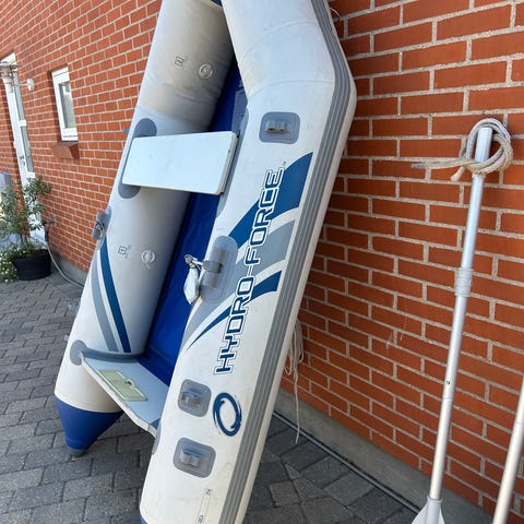 Oppustelig båd i grå farve med tilhørende udstyr. På billedet ses blandt andet bådens dug/skrog, stropper og kabler.