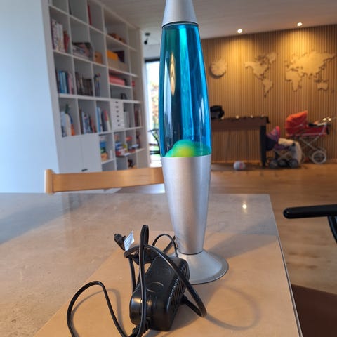 En dekorativ lavalampe med en turkisfarvet bund og top. Lampen har et klart væskeindhold med iskrystaller indeni, der bevæger sig, når lampen er tændt. Selve lampen har et vintermotiv med snefnug. Inkluderer sort el-ledning med stik.