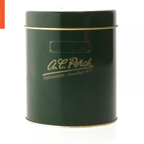A.C. Perch's thehandel metal dåse til opbevaring af te. Dåsen er mørkegrøn med gyldne, dekorative elementer og tekst. Dåsens form er kvadratisk med en aftagelig låg og måler 10x8 cm.