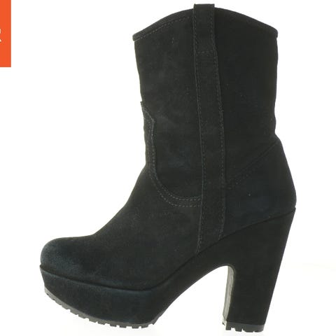 Et par høje støvler i størrelse 38. Støvlerne er sorte og lavet af et materiale, der ligner ruskind. De har en dekorativ søm langs siden og en blokhæl, der giver god støtte. Der er lynlås langs den indre side for nem påtagning og aftagning. Støvlerne har aldrig været i brug.