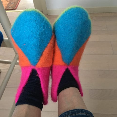 Dette er et par grønne hjemmesko lavet af blødt stof. De har en åben tå med en v-formet forsætning for bedre pasform omkring foden. Sålen er grå og har et mønster, der sandsynligvis giver skridsikkerhed på glatte gulve. Længden af hver hjemmesko er 26,5 cm.