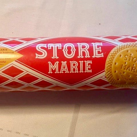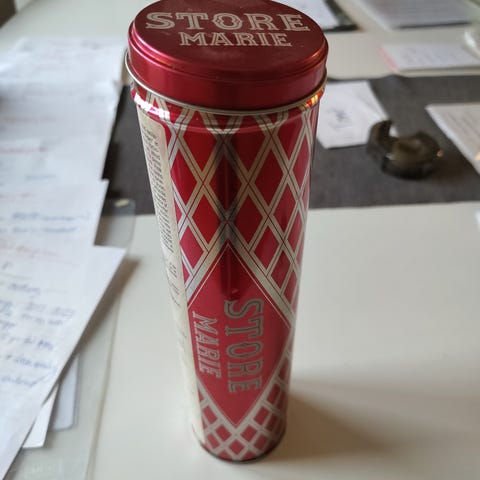 Denne vintage dåse er designet til opbevaring af Store Marie kiks. Den cylindriske metalbeholder har et dekorativt ydre med en rød og gul farveskema og mærket 'Store Marie' på forsiden. Dåsen har dimensionerne Ø 6,5 cm og længde 25,5 cm, og dens låg er aftageligt for nem adgang til indholdet. Den er perfekt til samlere eller som en retro indretningsgenstand.