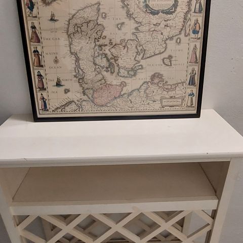 En detaljeret kort over Danmark i en ramme. Kortet har subtile detaljer, der viser både hovedområder og mindre øer omkring Danmark. Det er beskyttet af en glasoverflade og omringet af en tynd, metalramme. Rammen har en hængemekanisme bagpå for nem opsætning på en væg. Størrelsen på kortet er 30x40 cm.