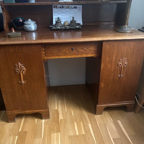Mega fint gammelt skrivebord, målet grøn. Skrivebordet har to skabe med hylder, og en stor skuffe i midten, så der er masser er plads til opbevaring :) Der medfølger også en nøgle, så skuffen kan låses af.