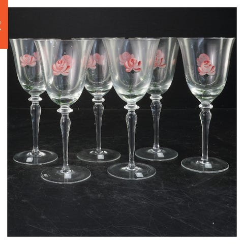 Et sæt bestående af fire transparente vinglas med dekorative mønstre af blomster langs kanten. Glassene er aflange med en bred fod, der sikrer stabilitet. De har en enkel og elegant design, hvilket gør dem velegnede til både hverdag og særlige lejligheder.