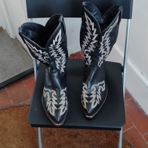 Et par sorte cowboy støvler i størrelse 40. Støvlerne har en karakteristisk hæl og nitter på siden, hvilket giver dem et råt og autentisk look. De er lavet af ruskind og har en elastisk indstigning for nem på- og aftagning. Der er tydelige tegn på brug, især på sålen.