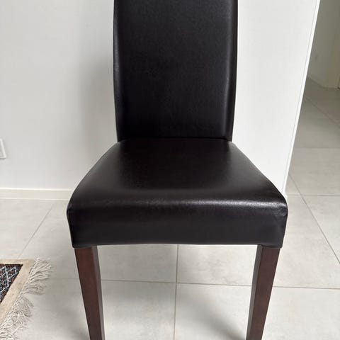 6 flotte spisebordsstole. Elegant design betrukket med sort slidstærkt læder. Stolene er flittigt brugt og 12 år gamle. Det kan ikke ses. Ingen skader eller mangler.