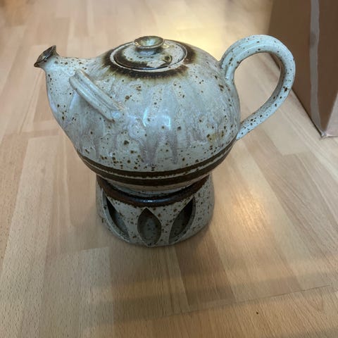 En grøn tekande med låg og hank, lavet af keramisk materiale. Tekanden har en klassisk form med en tud til hældning. Velegnet til servering af varm te. Størrelsen på tekanden er Ø 13 cm.